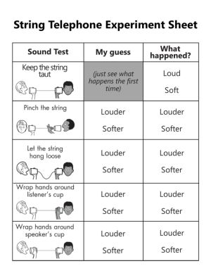 Decorate two cups with crayons or stickers. Carefully thread the ends of the string into the hole on the bottom of each cup, from outside to inside. Tie a knot on each end of the string. Optionally, you can also tape it down on the inside of the cup. Now, you and a friend hold the cups at a distance that makes the string taut (but don’t pull too hard or jerk the cups). Make sure the string isn’t touching anything else. One person talks into the cup while the other puts the cup to their ear. Can you hear each other? Try whispering and speaking normally. Experiment! Try the different tests on the Experiment sheet. Ask your child to make predictions/guess what will happen before trying each one.