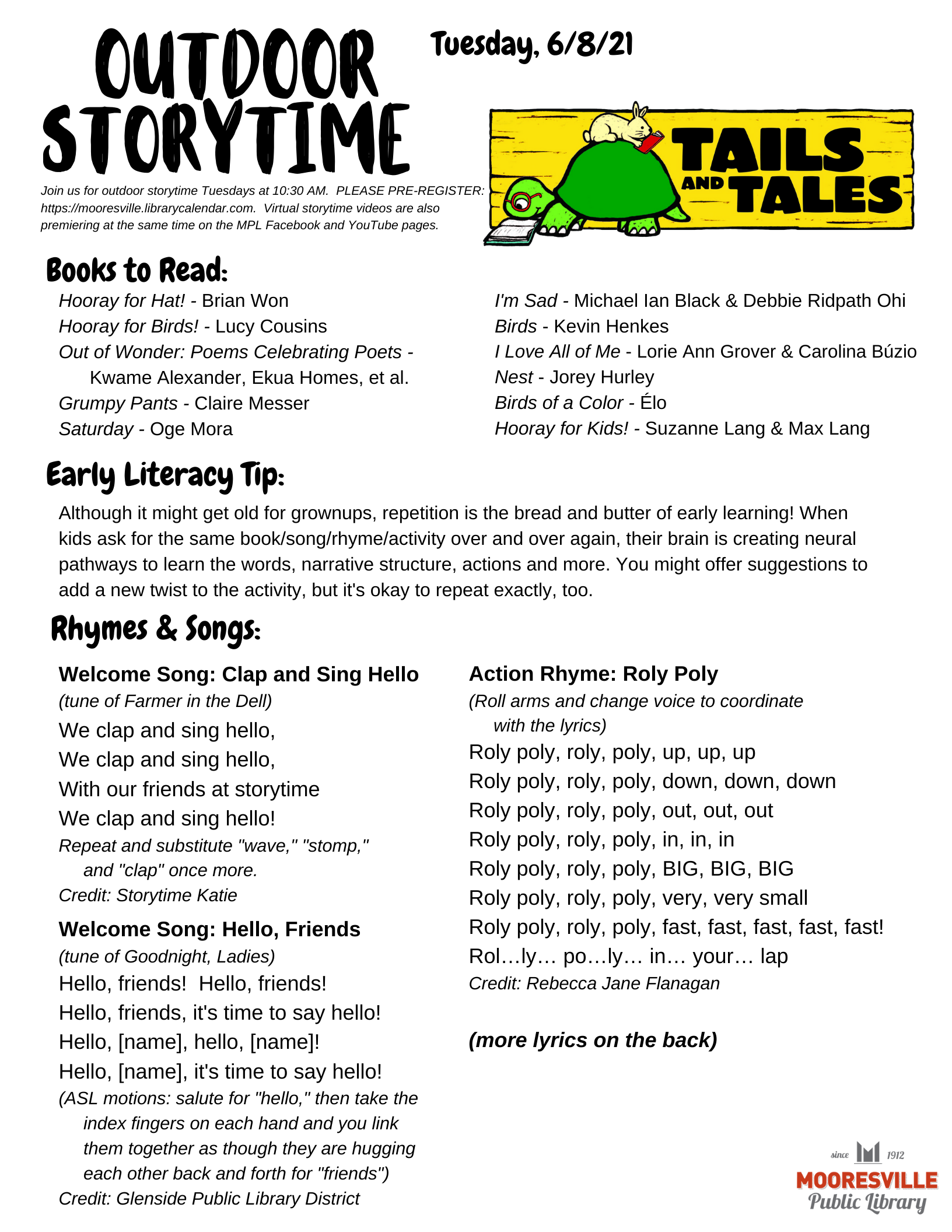 Early Literacy Tip: Although it might get old for grownups, repetition is the bread and butter of early learning! When kids ask for the same book/song/rhyme/activity over and over again, their brain is creating neural pathways to learn the words, narrative structure, actions and more. You might offer suggestions to add a new twist to the activity, but it’s okay to repeat exactly, too.