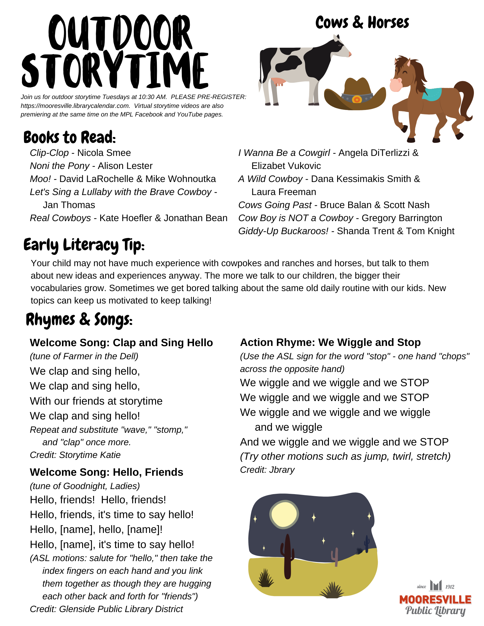 Early Literacy Tip: Your child may not have much experience with cowpokes and ranches and horses, but talk to them about new ideas and experiences anyway. The more we talk to our children, the bigger their vocabularies grow. Sometimes we get bored talking about the same old daily routine with our kids. New topics can keep us motivated to keep talking!