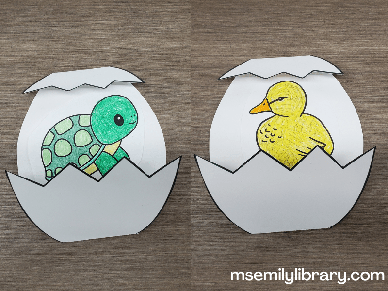 Inspiration for this craft came from Krokotak, but I wanted the option to choose what egg baby was inside your egg. I used Canva to find outline images of animals that hatch from eggs, and sized them and an egg shape to fit. There were enough egg babies for each child to choose several, and they could switch them out in their egg or glue one down.