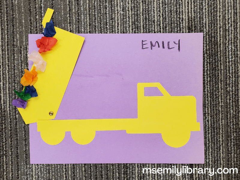 I love a craft that seems impressive but was easy for me to assemble! Our library has the dump truck Ellison die, so it was quick work to cut some out of yellow construction paper. They glued the truck cab and trailer to a background sheet, then used a brad to attach the box bed so it could pivot upward to dump. There were tissue squares that could be glued to the bed for the load, and crayons for any other decorating or details.