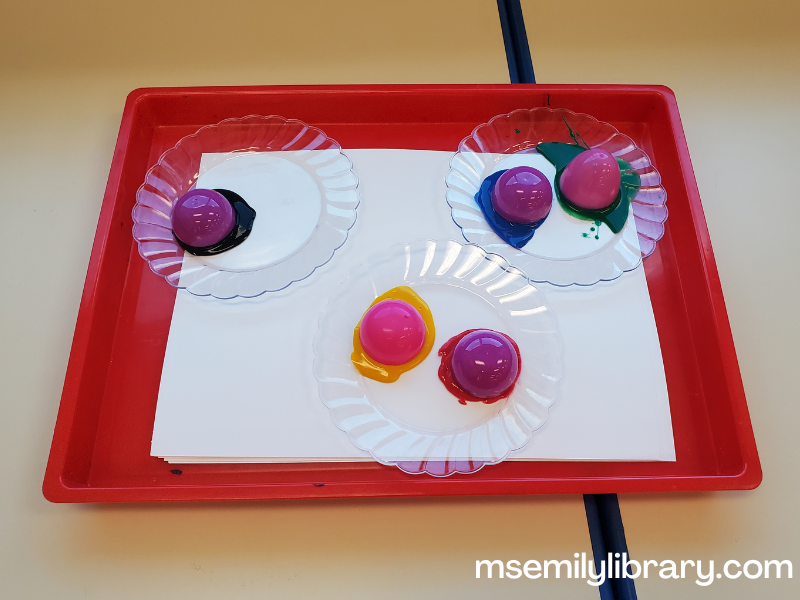I’ve done this craft before, and I love the simplicity of the process art which turns out looking cool. Instead of toilet paper tubes (another staff member needs them and our stash is low), I used plastic egg halves, which worked just as well.