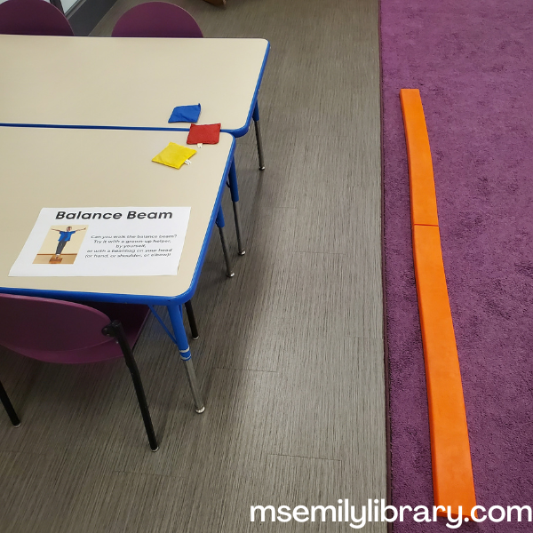 The original rhyme talks about a tightrope, but because I was tying it to the Olympics, I went with balance beam. To be honest, this one didn’t go great. Our beanbags are very slippery synthetic fabric, not a grippy cotton, so we all had a lot of trouble. I changed the rhyme in my third session!