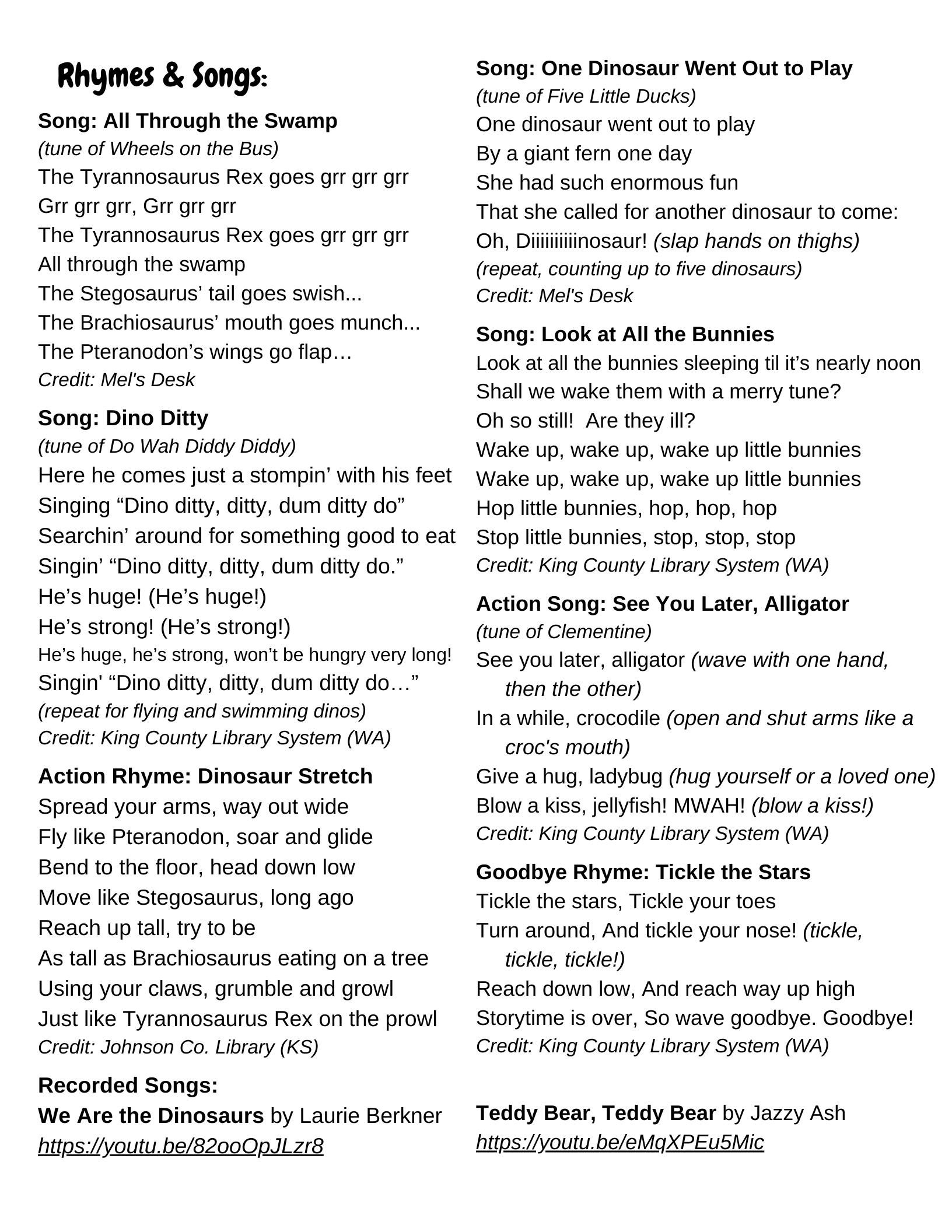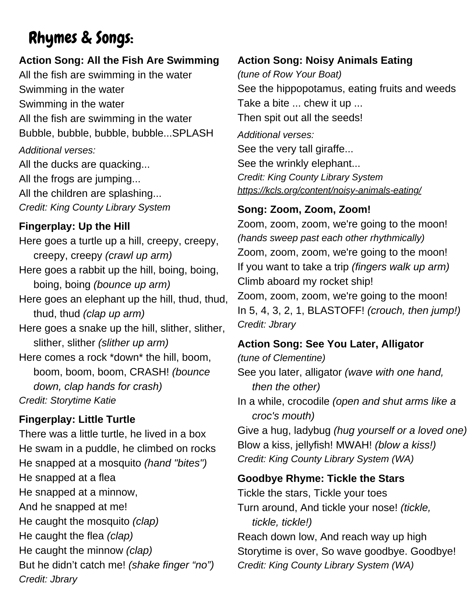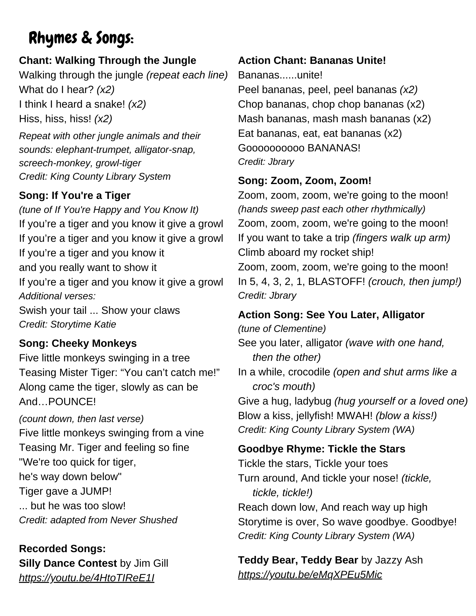 A note: I did include and use a “Five Monkeys” rhyme. I know that monkey rhymes have gotten a lot of attention in that the “Jumping on the Bed” one is rooted in racism. The one I used is about monkeys in the wild, teasing a tiger (I’ve also seen crocodile in other versions.) My thought is that this centers on the animals in their wild milieu and not anthropomorphized animals in a human setting. I don’t know if that’s the right call or not; I’m open to listening and learning.